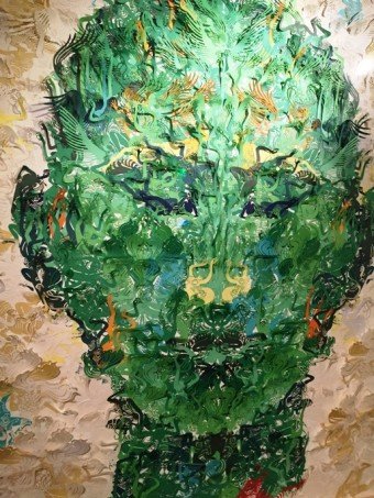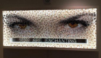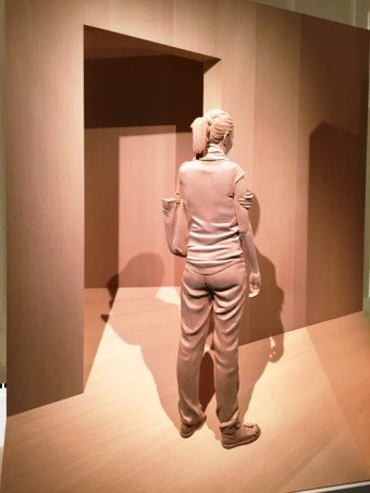 We move over to the art display that covers several rooms in the clean esthetics of white. And there are a LOT of cool pieces here to ponder. A interesting 3-d installation of a pair of piercing eyes claiming “You Are Enchanting”, it shifts depending on the viewing angle. A 3-D relief of a woman in front of a doorway. A really creative and large piece made of paper-cut pieces creating a mosaic of a face, very nice.