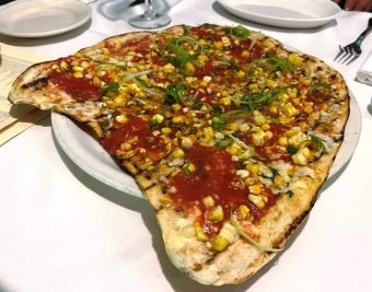 Our first treat (and surprise) for the evening is the popular Al Forno grilled pizza and we’ve ordered up the corn version. As someone who’s eaten a LOT of pizza in my life and just dined at Frank Pepe’s in New Haven, I’m blown away. This grilled pizza is oblong and organic in shape with grill marks on top a light red sauce, big kernels of plump corn, and shreds of scallion on top and served uncut. It’s confusing but I dive in, cut a slice off and it’s amazing! What a light, airy, crispy, and chewy crust, wow. The sauce is light so it doesn’t overwhelm the corn and the scallions add some green, oniony contrast. This pizza gets devoured quickly by the table and makes for a perfect starter at Al Forno.