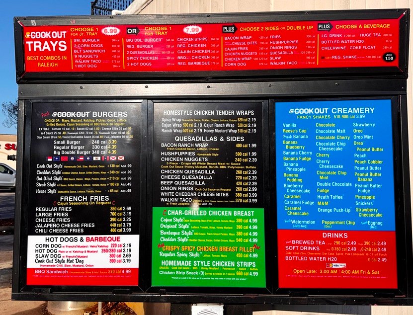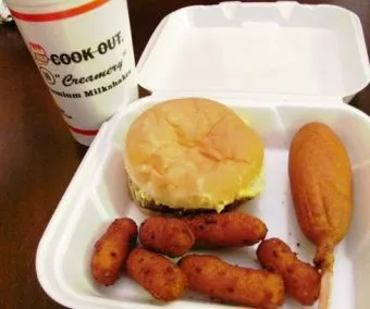 When I first moved to North Carolina in 2005, I was introduced to the concept of Cook Out. Confusion ensued when I realized this fast food joint was take-out only and focused on service through drive-thrus, often with a left-hand drive-thru. Wut wut? But over the years I learned that Cook Out was often a life-saver for a late-night meal and the Cook Out menu and Cook Out trays were pure, simple, deliciousness. Cook Out was founded in Greensboro, NC in 1989 by Morris Reaves and has over 290 locations in 10 states (NC, AL, GA, KY, MD, SC, TN, VA, WV, MS) throughout the Southeast. One of those locations happens to be a minute away from my home so I’ve curated pictures, menus, prices, and more for you to get the most out of your Cook Out order!