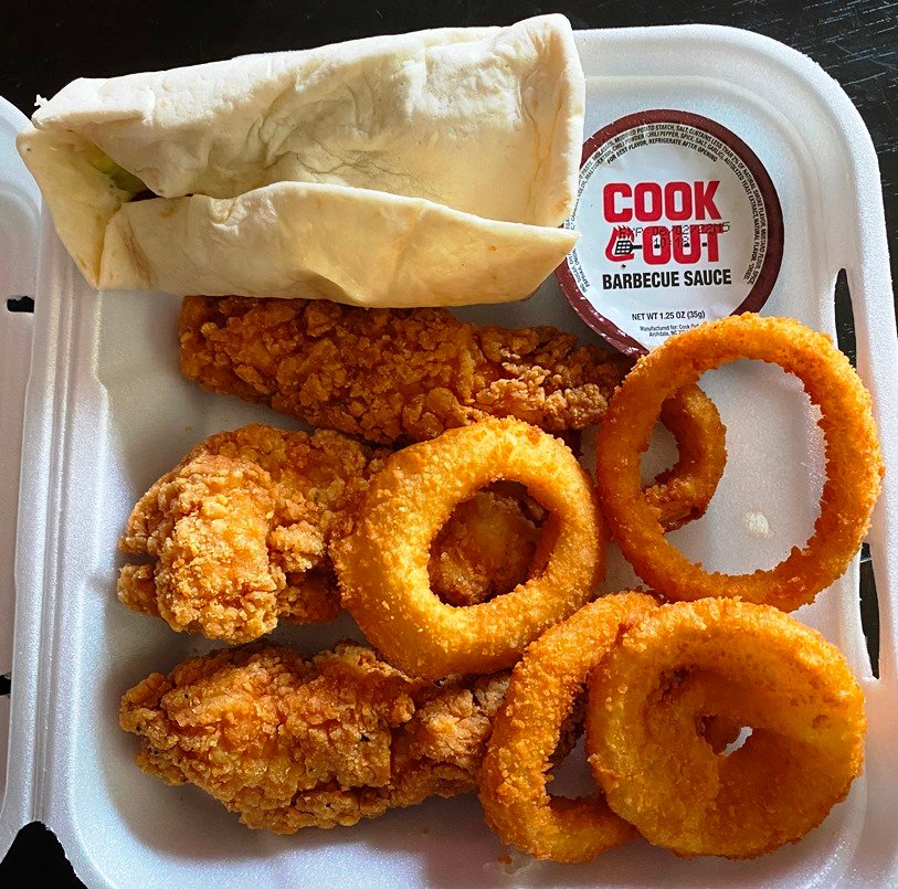 | Chicken Strips – Cook Out Sauce, BBQ, Honey Mustard, Polynesian, Ranch, Buffalo | 660 calories | 4.99 |