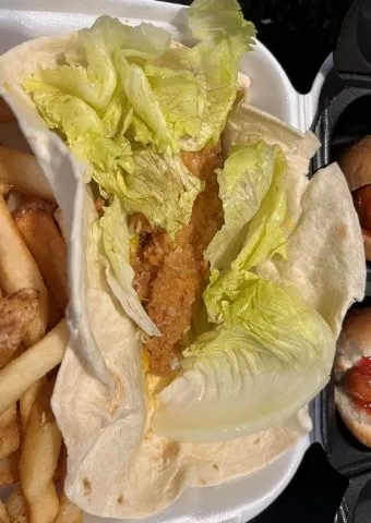 | Choose two sides or double up: Bacon Wrap, Cheese Bites, Chicken Nuggets, Chicken Wrap, Corn Dog, Fries, Hushpuppies, Onion Rings, Quesadilla (Cheeseburger, Chicken), Slaw | |