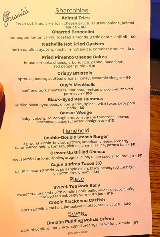 Grab a seat and a look at Gussie’s menu gives you a short list of shareables ($10 to $12), plates and sandwiches ($11 to $18), about 8 to 10 choices for each category! You’ll see favorites like meatballs, chicken wings, buffalo wings, smash burgers, and more. Gussie’s also has a couple of desserts, along with house-made ginger beer, root beer, and, orange cream soda. For adult beverages you’ll find 10 or so beers ($7 to $9) on taps along with a handful of cocktails and wine ($11 to $14) by the glass.