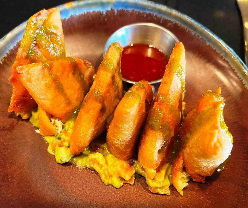Working through the menu at La Montaña is a bit of fun (sample menus at bottom of post). Think mash-ups and twist-type dishes, mostly Latin-American in form but with Asian flavors mixed into the concept. Their smaller plates (tapas) are in the lower teens while the main plates are about $20 to $30 and the cocktails about $15 plus. Start with their chicken empanadas which are served up sliced in half and sitting on edge! A layer of guacamole lies underneath and they are drizzled with green tomatillo sauce but served with a sweeter Thai chili sauce, hmmm… The empanadas are nicely stuffed with white chicken meat and it’s a very satisfying starter.