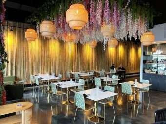 Inside La Montaña, things start to get fun! The dining room is open, dark polished floors with a jungle-like theme. The walls are lined with bamboo poles and there are splashes of green throughout the space. The bar to the right features green lighting with green tile along its face. Overhead you’ll find woven light fixtures along with a bed of hanging flowers which remind me of wisteria. It’s a good-looking space and a lot of thought went into its interior design and decor for diners.