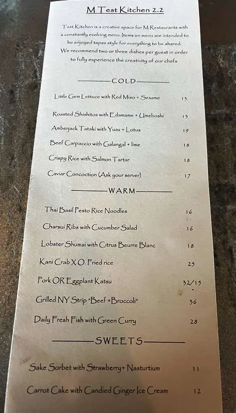 Given its name, M Test Kitchen will likely be evolving its menu pretty rapidly from month to month. For my first media visit, the menu was at version 1.1 and for my next visit about a month later, the menu was at version 2.2! In the parlance of developers, that’s a major rev and the menu was about 50% different from my earlier visit which gives you an idea of what to expect. The menu is organized by cold, warm, and sweet plates so expect to share! Prices are mostly between $13 to $35 and I’d expect to get 2 to 3 plates per person for a full meal. And given the evolving nature of the menu, if there’s something you like in particular, don’t wait too long for a repeat visit to order it again!