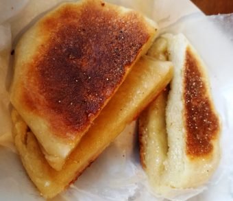 I immediately spy a lady tending to a griddle of puffy, browned muffins to the side. They look vaguely similar to what you might find at Teeters but WAY puffier, fluffier, taller and bigger. For my mid-day snack I order up a basic muffin top with honey butter along with their sausage, egg and American cheese sandwich! The muffins on the griddle are just finishing up, so a 10 minute wait for my order seems worthwhile to get it hot and fresh.