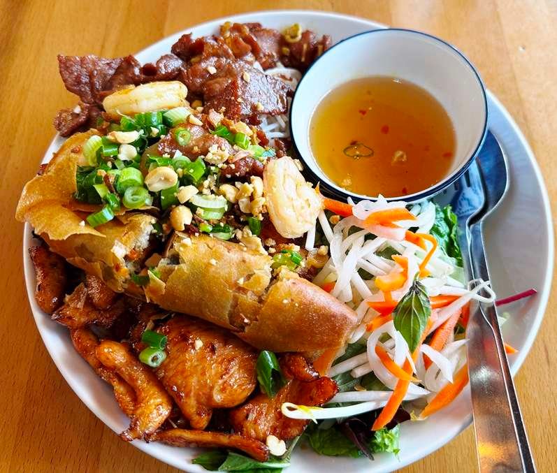 For mains, I’ve done the special banh mi and combo vermicelli bowl. Again, there are some small twists in the items here. The special banh mi is a monster of a sandwich. Crisp but soft roll stuffed with grilled pork, sausage, and topped with a fried egg. With pickled daikon, carrot, cucumber, cilantro, and daikon, you get a burst of flavor in every bite. The combo bun (vermicelli) is also solid but served up a bit differently in a flatter, wider bowl. One thing I definitely noticed is that Midtown Pho grills their pork heavily resulting in excellent caramelization but sometimes drying the meat out a bit, your mileage may vary here. But this combo bun bowl is super satisfying and filling, there’s a LOT of food here.