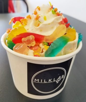 The Milk Lab Cafe has two ice cream prep surfaces but they’re not too busy today so only one is being run by a young guy in black. Cream is poured on top and spread across the freezing surface along with a cup of fruity pebbles. Choppity-chop-chop-chop, he quickly smashes up the cereal and scrapes up the ice cream mixture across the surface again. Honey and caramel are drizzled on top with squeeze bottles and the process repeats itself. In a couple of minutes, the mixture has frozen pretty solid and he scrapes the mixture off into six separate rolls. They’re placed in a cup where you can finally add unlimited (well, limited by the size of the cup!) toppings to your frozen treat.