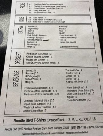 (Moved to new location at 1718 Walnut Street, review will be updated soon) When it comes to Asian food, the Triangle can be a bit tough in terms of finding authentic eats. But over the years, Cary has been a bit of a mecca if you’re up for down-home Chinese or Indian food in the area. And now you can add ramen to the list! While more and more restaurants have been adding it to their menus, ramen shops are a bit tougher to find outside of Dashi in Durham. So I was excited to see all the great reviews roll in for Noodle Blvd in Cary! Especially with the cold weather coming soon, ramen can be a really heart-warming comfort food for me so off I go…