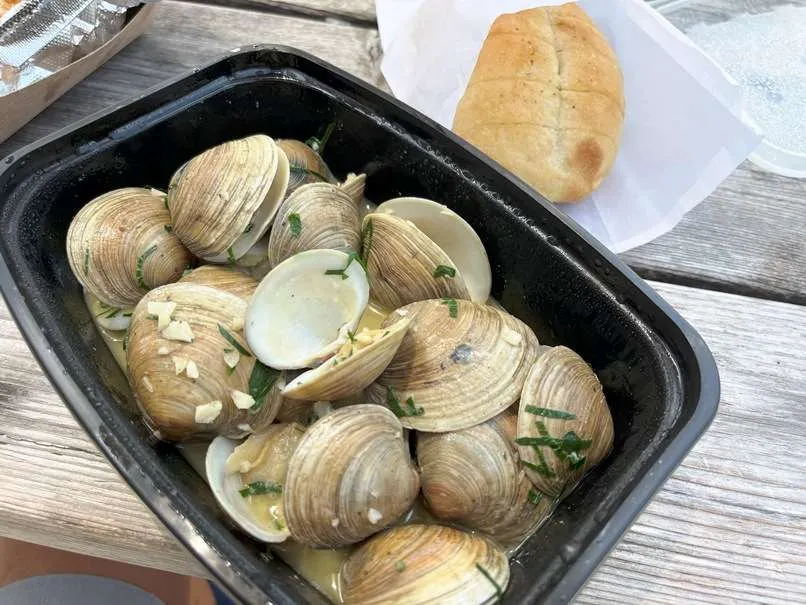 Contact them by email before a visit and they will get you a copy of the menu for that day’s service. There’s usually a nice range of appetizers, sandwiches, entrees, and sweets available, I’m sure the menu changes often. Order at the truck and you’ll be given a buzzer when your meal is ready. And it may take a bit of time but everything I’ve eaten with Portable Portugy has been hot and fresh, no luke-warm offerings here. The steamed little neck clams in a white wine, butter sauce (ameijoas a bulhao pato) were nicely cooked and served up in a generous portion with light, crunchy Portuguese bread.