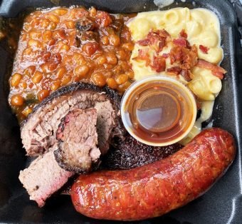 As you wait in line, there’s a wall menu to help you decide what to order along with a bin full of crushed ice, soda bottles and beers to get you a head-start on a beverage. A wall of articles and accolades also shows off the pitmaster expertise of operator-owner Chris Prieto who has spent many years, smoking meats. Turn the corner and you’ll hit the prep area where your order will be taken and you may get a preview taste of their meats. I’ve been lucky enough to nab a juicy chunk of brisket at the counter while ordering! Thankfully the Prime Barbecue menu is short and focused on their smoked meats: beef brisket, pork ribs, chicken, turkey and pulled pork. You can get your meats in plate or sandwich form along with 6 or so Southern sides to accompany your meal. Note that Prime Barbecue also has daily specials that you don’t want to miss, offering chicken fried steak, beef ribs, burnt ends, Frito Pie and more on specific days. Prime also offers a short list of desserts (cobbler, pie) but I can never make it that far from a calorie perspective.