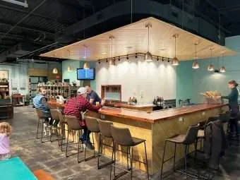 If you plan on visiting Riparian, take note that’s in a busy area off of S. Saunders and sits in a tight plaza next to Slice Pie Co. with Earp’s Seafood next door. There are about 9 parking spaces in the plaza, otherwise, you’ll have to find parking on a side street (Maywood or Summit). Access to the small parking lot is also a bit steep so take care as you pull in and out! But once you find a spot, you’re in for a surprise! Inside Riparian, the feeling is light, bright, and open. Large plate glass windows up front to watch the street action along with the roll-up garage door make for a lot of natural light. On the right-hand side, there’s a nice corner bar, paneled in light woods, some refrigerated cases for cans and bottles of adult beverages, and a small lounge area for kids and games. To the left is the main seating area, a retail area with wine, plants, and Riparian merchandise. The polished concrete floors give the space a slightly industrial feel to the space but it all feels very comfortable.