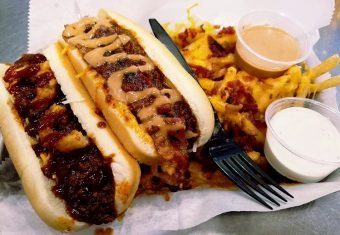 It takes 10 minutes or so for my food and wow, it’s a lot! I’ve ordered up the Smokehouse and Western dogs which come sitting on top of a aluminum tray along with my cheese fries! Sides of Sup sauce and ranch complete the meal. The Western dog (onion ring, BBQ sauce, Monterey Jack, cheddar cheese and chili) and the Smokehouse dog (bacon, Monterey Jack, cheddar cheese, Sup Dog sauce, and chili) come loaded with toppings. And they are good sized beef dogs which can stand up to all the toppings. And they’re both quite good, I like the creative options on the Sup Dogs menu. Digging in the bacon cheese fries feels like another 1,000 calories but I can’t resist! The fries have a bit of skin and great potato taste. The cheese and bacon bits are generously coated on the pile of fries, too. And the Sup Sauce is wonderful, probably a tangy, savory Thousand Island mix that is perfect for dipping. All in all it’s a filling meal with plenty of salt, grease and deliciousness!