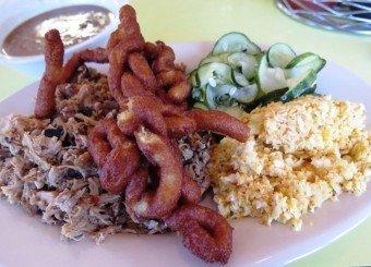 It takes about 10 minutes and my plate gets delivered to the table. And it all looks great! One large plate loaded with barbeque, sliced cucumbers, yellow slaw and curly-q hush-puppies along with a cup of baked beans. It’s a smorgasboard on a plate, I start with the fresh and tangy cucumber slices which are perfectly marinated. The slaw looks like it may have some mustard in it (yellow color) and is decent but doesn’t stand out. But the que here at the Pig? Excellent! It’s got a medium chop and is whole-hog so I can definitely taste the luscious fattiness in the meat. Great smoke flavor with a hit of pepper makes it a great version of NC barbeque. And the hush-puppies are nicely fried and presented in funnel-cake fashion, pretty cool! Overall the food here at the Pig is great and heeds NC barbeque tradition but does it slightly different.