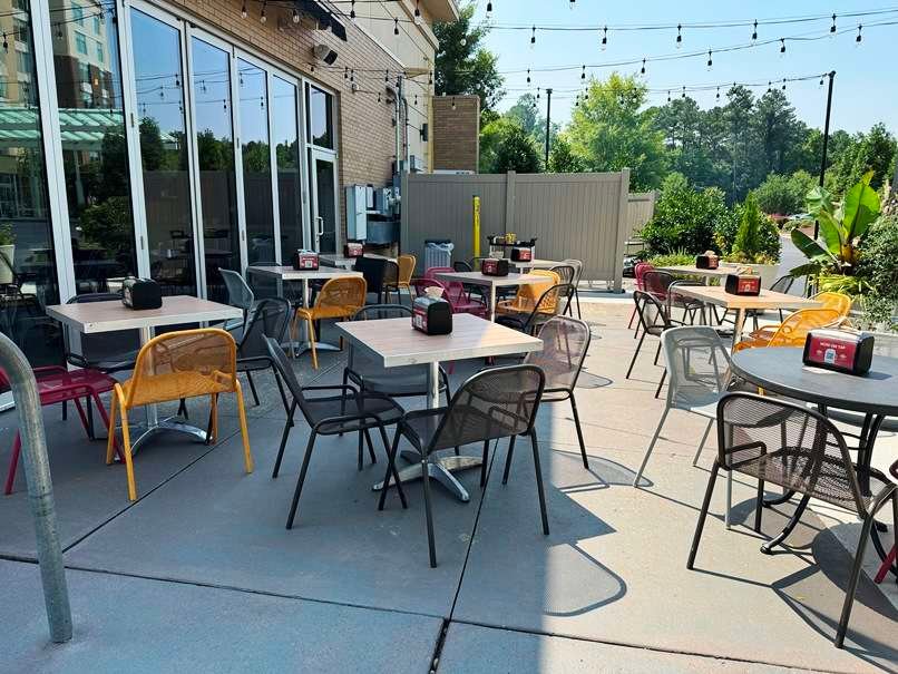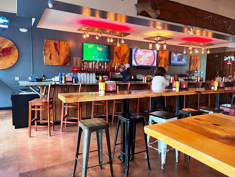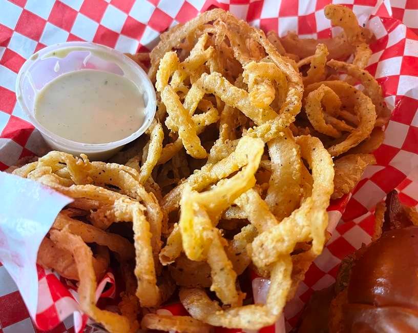 With four locations in the Triangle (S. Durham, Raleigh, Chapel Hill, Holly Springs) you’ve got multiple options in the Triangle to visit this restaurant. The Durham location is located conveniently right off of I-40 in a little plaza with an Aldi, Smashed Waffles, and Bonefish Grill, but there’s plenty of parking in this busy plaza. Walking up to Town Hall Burger and Beer (THBB), you’ll notice the substantial patio seating up front and to the side. Inside the front double-door you’ll find yourself in the first dining room. Town Hall Burger & Beer is counter order with some 4-tops up front and a refrigerated case of drinks. Large LED TVs up front display the menu and prices overhead.