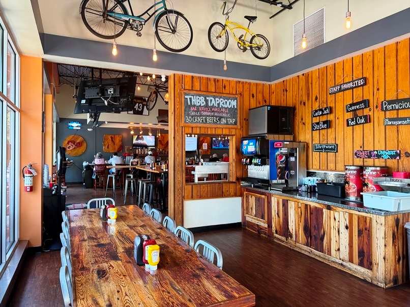 But to the left, you’ll find a second dining room, a bit larger and more eclectically decorated. There’s a variety of high-top tables with stools and pub chair seating, the bar on the side offers 30 or so taps along with the latest games on TVs. This room has a bit of a sports bar feel and would serve you well for game day! The overall ambiance of THBB is casual, beer bar and pub decor that’s light, bright and comfortable for all. And don’t forget about the patio in front when the weather is nice.