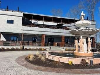 As you approach the entrance of ZincHouse, keep your eyes peeled! The complex is still being finished up from a construction perspective so don’t be surprised if the roadway is unpaved or covered with gravel. Just follow the signs as best you can and press on! To the left of ZincHouse is plenty of parking, it’s meant to be a high-volume events venue so it’s just a question of how close you can get to the building. It’s an interesting-looking venue with a main structure for the winery and brewery, a chapel-type building (The Pavilion), and the Carriage House to the side. A large fountain with Greek statue and pool burbles up front as the centerpiece of the venue. Far away in the distance is a private residence where I believe the owner fo the ZincHouse lives.